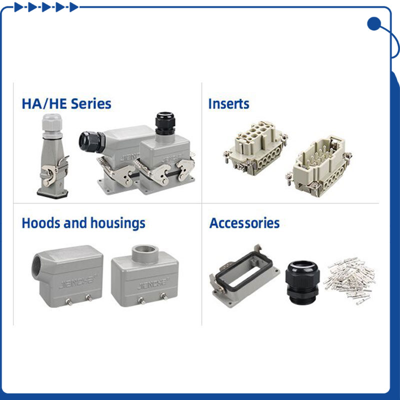 각 헤비 듀티 전원 커넥터에는 수컷 및 암 인서트, 나사 종료 접점, 측면 또는 상단 입구 후드, Bulkhead Mounted Housing 및 Cable Gland가 포함됩니다.